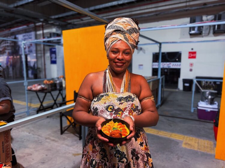 Em outra barraca, o cheiro do azeite de dendê anuncia a presença das tradições de matriz africana. O preparo do acarajé, atravessado por ritual, memória e espiritualidade, vai além da gastronomia. “Alimenta também a alma. A gente faz o possível para trazer aquele resgate ancestral”, afirma Carla Azevedo, cozinheira e mulher do candomblé.