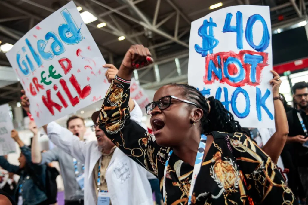 Ativistas de diversas partes do mundo se reuniram no Global Village, um espaço destinado à sociedade civil, para exigir que a farmacêutica Gilead reduza os preços do Lenacapavir, uma nova droga de longa duração para prevenção e tratamento do HIV.
