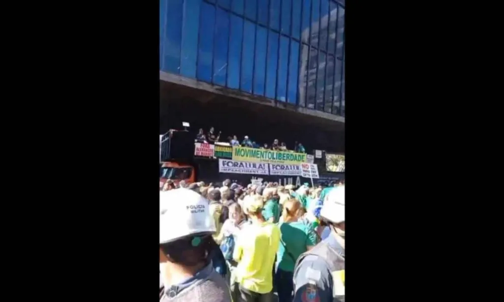Durante o ato, faixas e cartazes pediam ajuda ao bilionário Elon Musk, sugerindo uma "ditadura" em curso no Brasil