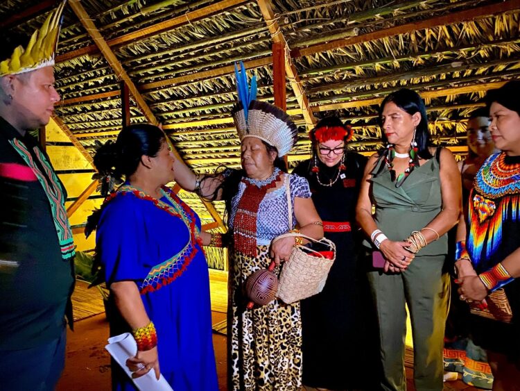 Essa inversão – o Estado se aproximando do território ancestral, e não o contrário – deu ao momento uma força inédita. Ervas, defumação, cantos de encantaria. Esse gesto é profundamente político: significa que o Estado reconhece que o cuidado espiritual e territorial pertencem às mulheres indígenas e que o poder delas não se subordina ao poder institucional — se soma, se cruza, se tenciona. É um outro modo de fazer política.