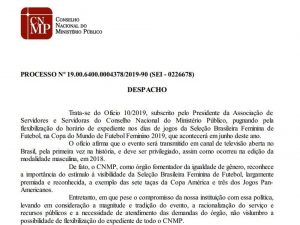 A Associação de Servidores do Conselho Nacional do Ministério Público (CNMP) entraram com o pedido para flexibilizar o expediente durante os jogos do Brasil na Copa do Mundo de Futebol Feminino