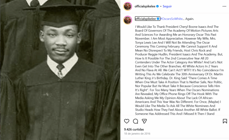 Na ocasião, Spike Lee — diretor e ator conhecido pelos filmes Infiltrado na Klan e Faça a Coisa Certa — criticou publicamente a premiação em suas redes sociais. “Mas como é possível, pelo segundo ano consecutivo, todos os 20 indicados nas categorias de atuação serem brancos?”, questionou o diretor em uma publicação nas suas redes sociais com uma foto de Martin Luther King — lembrando também de seu aniversário e seus discursos.