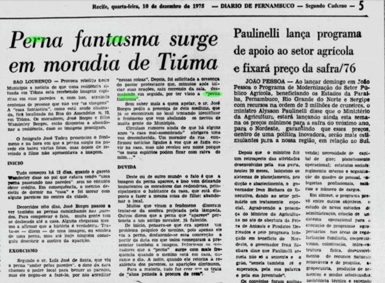A cronologia exata desse fenômeno começa em 10 de dezembro de 1975. Sob a manchete “Perna fantasma surge em moradia de Tiúma”, o Diario de Pernambuco — o jornal mais antigo em circulação na América Latina — relatava que um homem chamado José Luís Borges jurava ter visto uma perna caminhar pelas paredes de sua casa, em São Lourenço da Mata. O pânico foi tamanho que envolveu médiuns, pastores e até o padre da cidade, Ludugero, que, segundo o jornal, chegava a agredir quem lhe pedia ajuda espiritual sobre o caso.