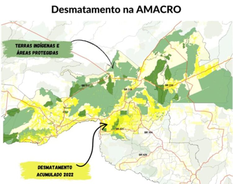 No contexto da Zona de Desenvolvimento Sustentável (ZDS) Abunã-Madeira, conhecida como AMACRO, esses processos têm se intensificado, sobretudo em relação ao desmatamento e conflitos territoriais. Em 2022, ainda que a taxa de desmatamento para a Amazônia Legal, tenha sido de 11.568 km2, registrando uma redução de 11,27 %, quando comparado com o desmatamento consolidado para o ano de 2021. O estado do Amazonas foi o único que apresentou aumento no desmatamento para o mesmo período, totalizando uma variação de 13,5% neste período (INPE, 2022), com grande representatividade dos municípios do sul do estado, que configuram a AMACRO. Apuí e Lábrea, em 2022, foram os municípios que mais tiveram áreas desmatadas, que abrangem as florestas públicas não destinadas, assentamentos rurais, como Projeto de Assentamento Juma (Apuí) e Projeto de Assentamento Monte (Lábrea) e áreas protegidas, como o Parque Nacional de Mapinguari, no município de Lábrea e a Reserva Extrativista do Guariba, a Floresta Estadual de Manicoré e o Parque Estadual do Sucunduri, em Apuí.