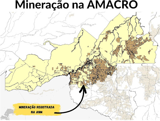 A pressão pela exploração mineral na região da AMACRO não apenas se mantém, mas se complexifica e expande territorialmente. Segundo dados da Agência Nacional de Mineração (ANM) consultados em março de 2025, há 186 processos minerários ativos registrados na região que compreende a AMACRO. Esta “paisagem de requerimentos” (ACSELRAD, 2022) cria uma nuvem de expectativas e pressões sobre o território, mesmo antes da efetiva abertura de minas, funcionando como um dispositivo de desestabilização fundiária e ambiental.