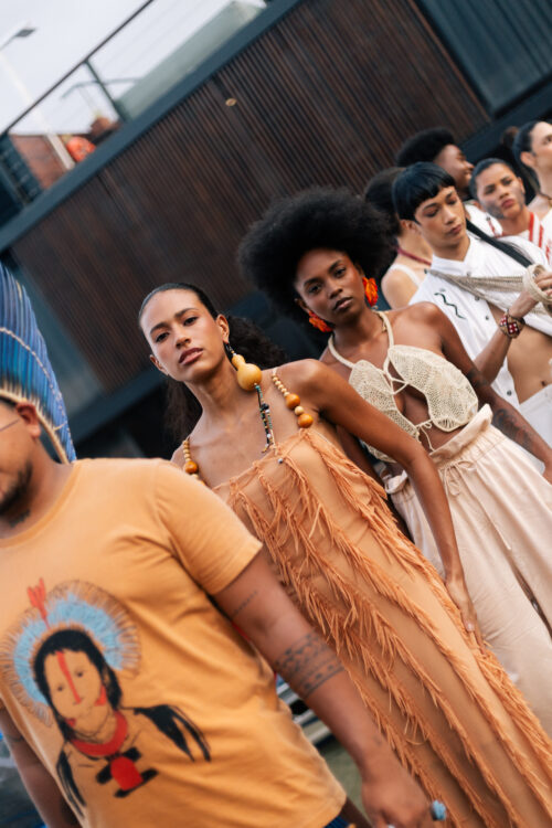 O movimento ganhou potência com a direção criativa de Sioduhi, artista e estilista indígena, que transformou a passarela suspensa em ritual. A sonoridade conduzida por Djuena Tikuna fez da travessia um acontecimento político: cada passo era afirmação de existência; cada peça apresentada, lembrete de que a floresta produz mais do que commodities, produz linguagem, cosmologia e futuro.