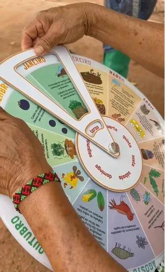 O processo de atualização envolveu representantes de 11 aldeias e ocorreu em duas etapas, com a validação final do conteúdo sendo realizada em fevereiro de 2025, na Aldeia Serra Azul. As informações e os conhecimentos ancestrais sobre o tempo, o plantio e os rituais, combinados com a observação das mudanças atuais, foram transformados em um livro e um calendário interativo, com ilustrações feitas pelos jovens participantes da oficina.