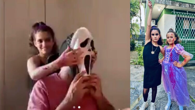 E, ainda não satisfeitas com o banho de sangue cênico, as duas cobriram o rosto dele com uma máscara do Pânico, quase como um lembrete: chega de filme cabeça por hoje.